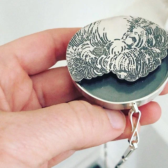 (note: the silver glass beads gradually escape through a hidden filter and fill the visible chamber as the wearer moves around. At the end of the day, the beads can be shaken back into the hidden chamber, behind the clouds, ready for the next day.)